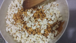 Pop some popcorn throw it into a bowl/dish. Make the caramel sauce. I used a mix of sugar, butter, cream and salt pour over popcorn and you're good to go. I popped mine into the oven but like I said make sure you remember to watch it and don't get distracted with feeding the puppies lol